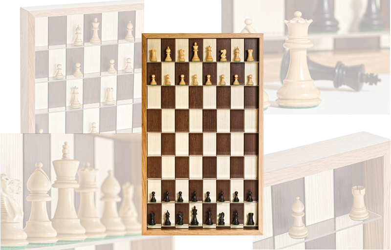 The board, designed and built in collaboration with a master carpenter, features an oak frame, stained ash 8×8 board, and – to support the pieces – transparent acrylic shelves [80cm (H) x 48.1cm (W) x 6.8cm (D)]. It’s designed to be wall-mounted, just like a picture or photograph, with the traditional 8×8 squares becoming portrait-oriented oblong ‘cells’ [9cm (H) x 5.2cm (W) x 6.8cm (D)]. At present, ChessTheGame.co.uk retails this for £235 RRP, including a set of high quality, traditional Staunton style chess pieces. These sets are carved in finest Boxwood & Sheesham (Golden Rosewood), and come with four Queens; all pieces are double-weighted, with green-felt padded bases. These are beautifully crafted chess sets in their own right, and a perfect compliment to the vertical chessboard in which they reside.